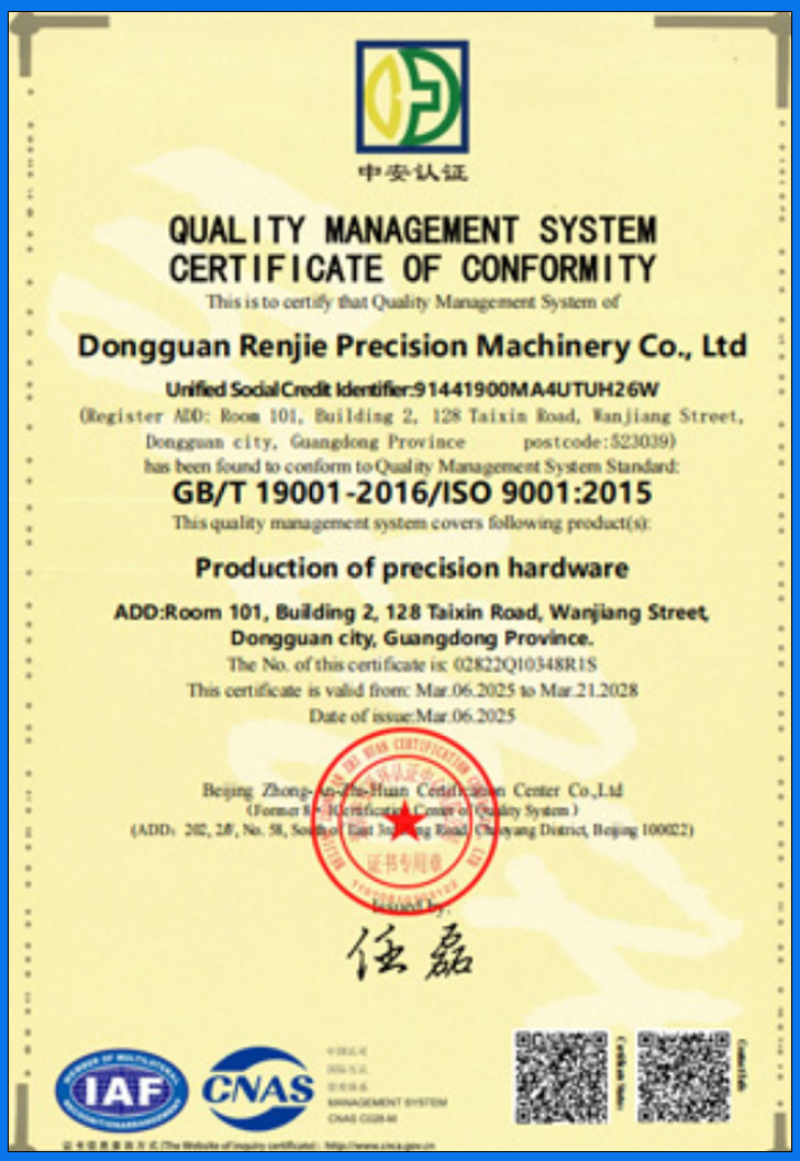 Dongguan Renjie Precision Machinery Co. Ltd.is a professional manufacturer of customized precision spare parts established in 2011.After more than ten years of precipitation the company now has a professional and responsible machining production team,of which the average working time of the core team personnel is more than 15 years, and has developed into a comprehensive precision parts machining manufacturer integrating design,production and assembly.